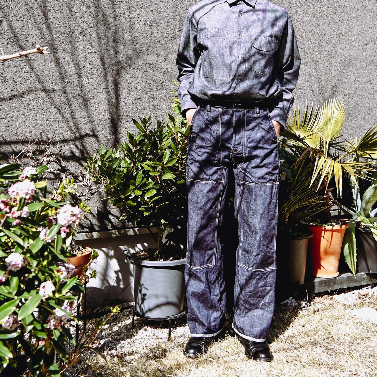 ワイドで直線的なシルエットのワーキングウェアとして、実用的なポケットを配置して様々な日常の作業や移動のために薄めの10.5ozのデニムで作成しました。